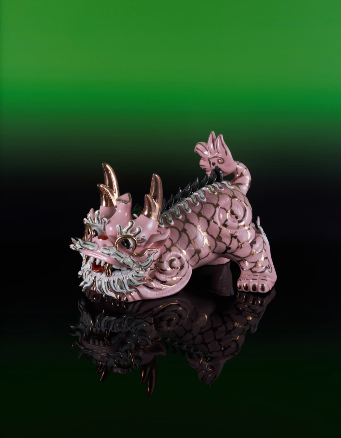 The Kirin is a mythical chimerical creature said to represent peace and good fortune. The fortuitous creature is depicted by XIXINGLE with an intricately detailed porcelain sculpture in a playful pose, complete with hand painted detailing throughout.
