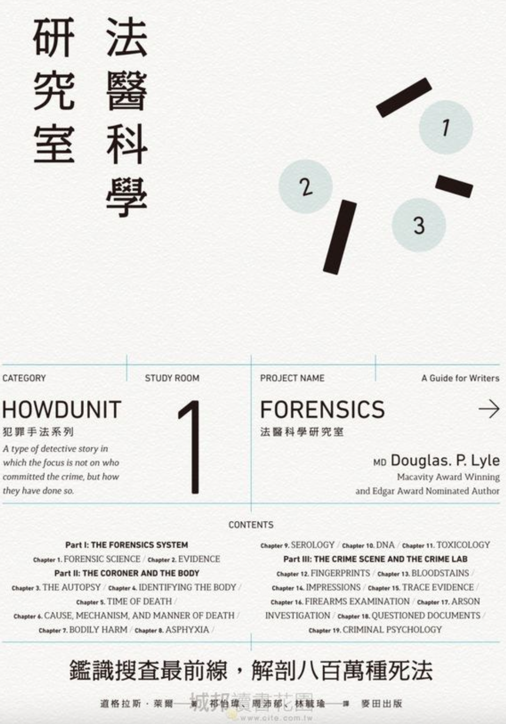 「打從下定決心以推理創作為終生職志以來,我一直在尋找任何有關鑑識科學和犯罪偵查的書籍,好供寫作時參考運用,但大多數參考工具書不是太過粗淺,無法深入探究,就是過於艱深,難以讓非專業人士理解。如今道格拉斯.萊爾的《法醫科學研究室》出版,簡直令我如獲至寶,此書不僅有系統地條列鑑識科學與犯罪偵查的各項領域,更在每段章節當中列舉一些案例加以佐證,使讀者可以清楚詳細地吸收相關知識,堪稱目前國內最具參考價值的推理寫作工具書籍。」──陳嘉振(推理小說家、編劇)
