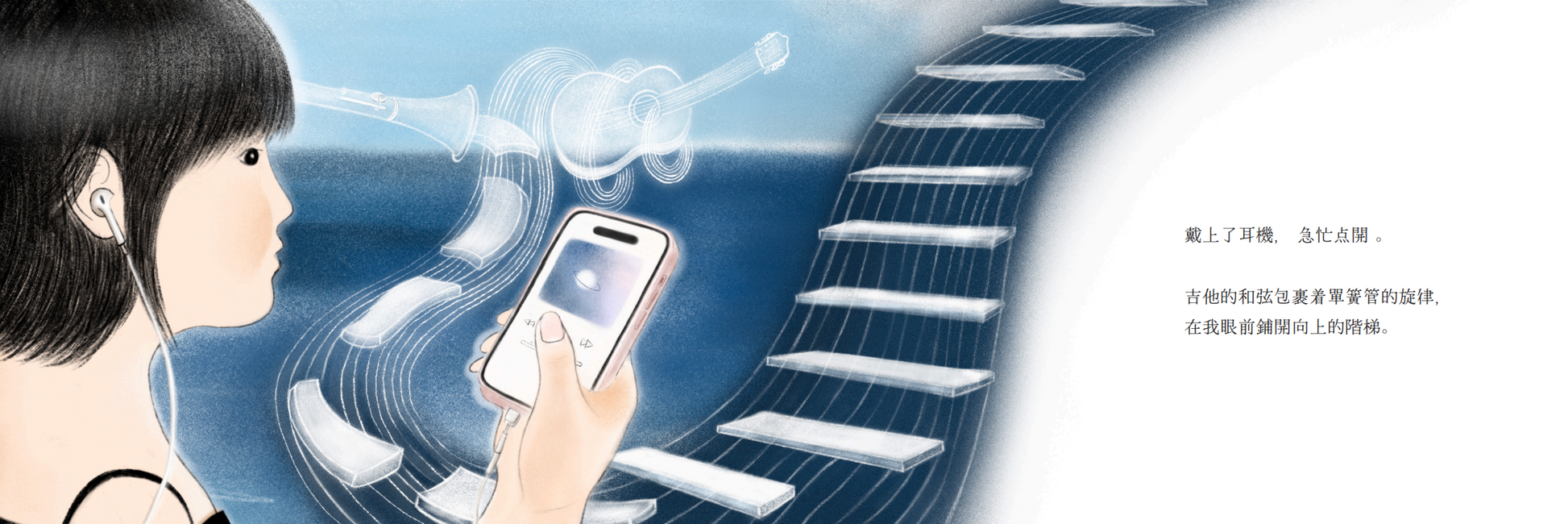 前阵子读到一本关于音乐和心理情绪的书籍,书里说:你无法阻挡浪的到来,但你可以学会冲浪。音乐帮助我们漂浮起来。在这个语境中,漂浮反而成为了一件好事。