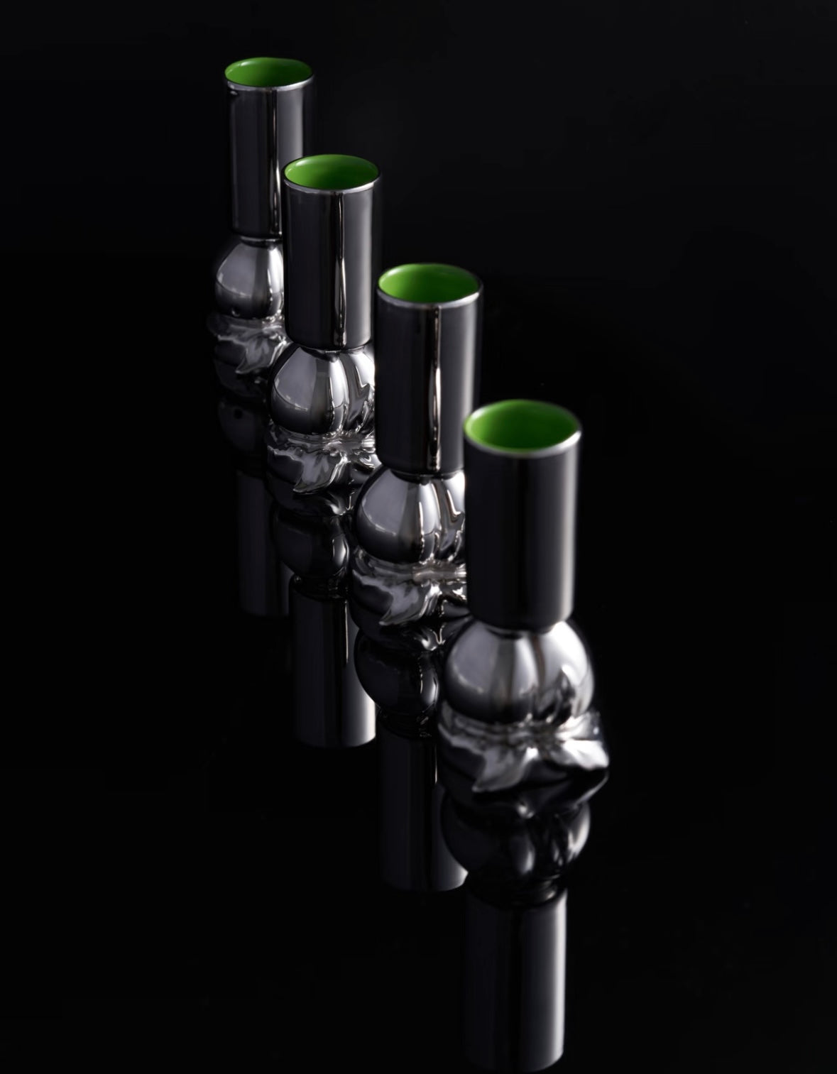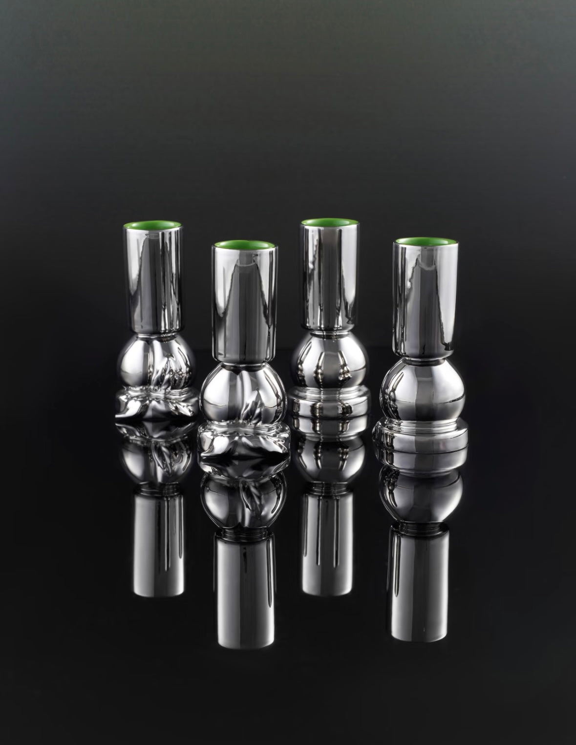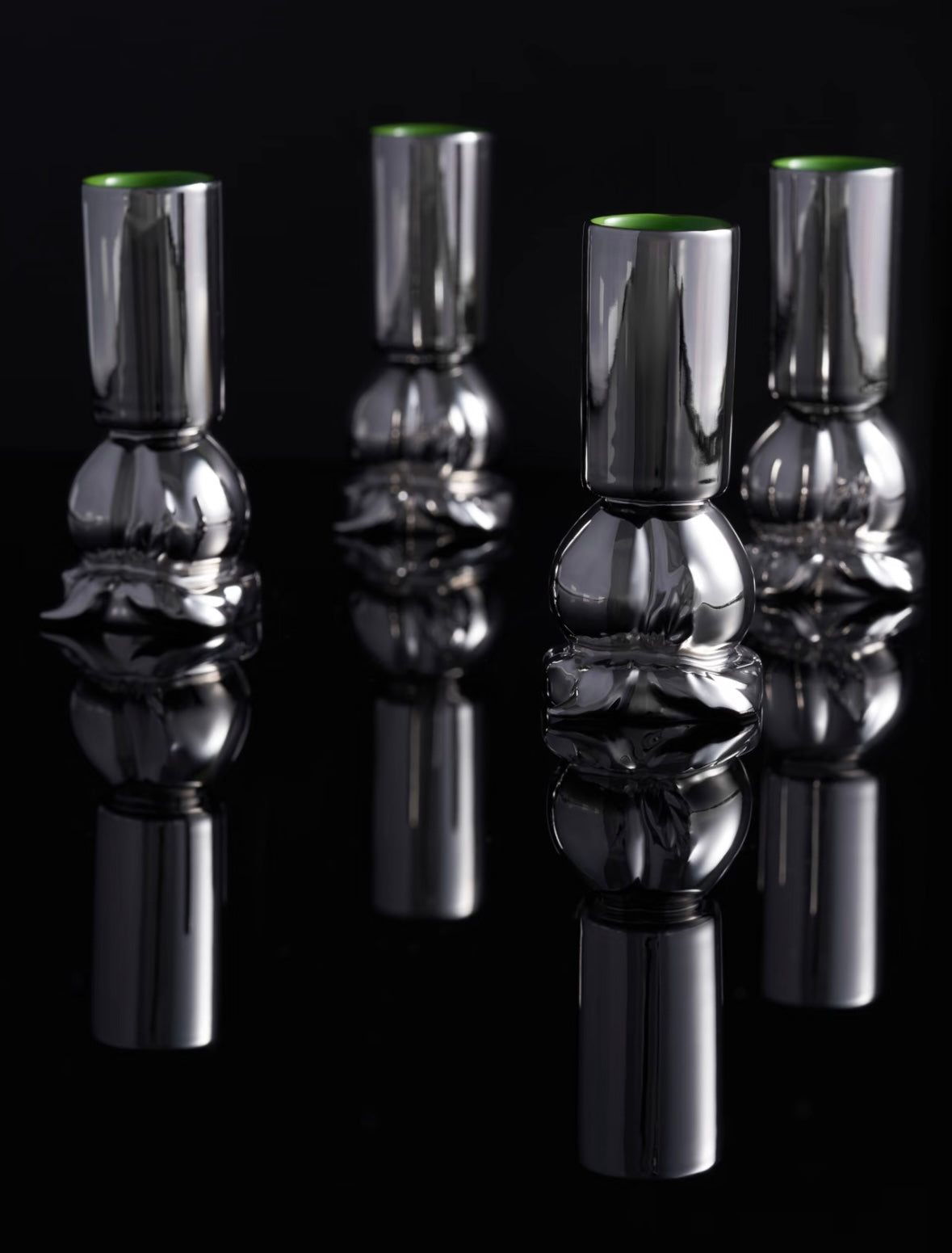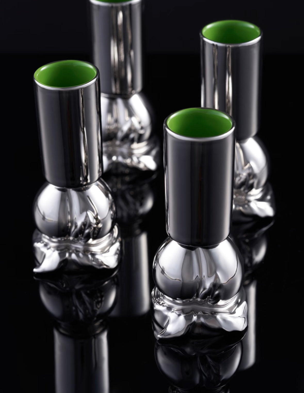These beautiful shot-sized cups are entirely handcrafted porcelain and feature a sculptural peach base that transitions to a tall cup. They all have a high gloss silver glazed finish, whilst the inside is set in a contrast green coat.