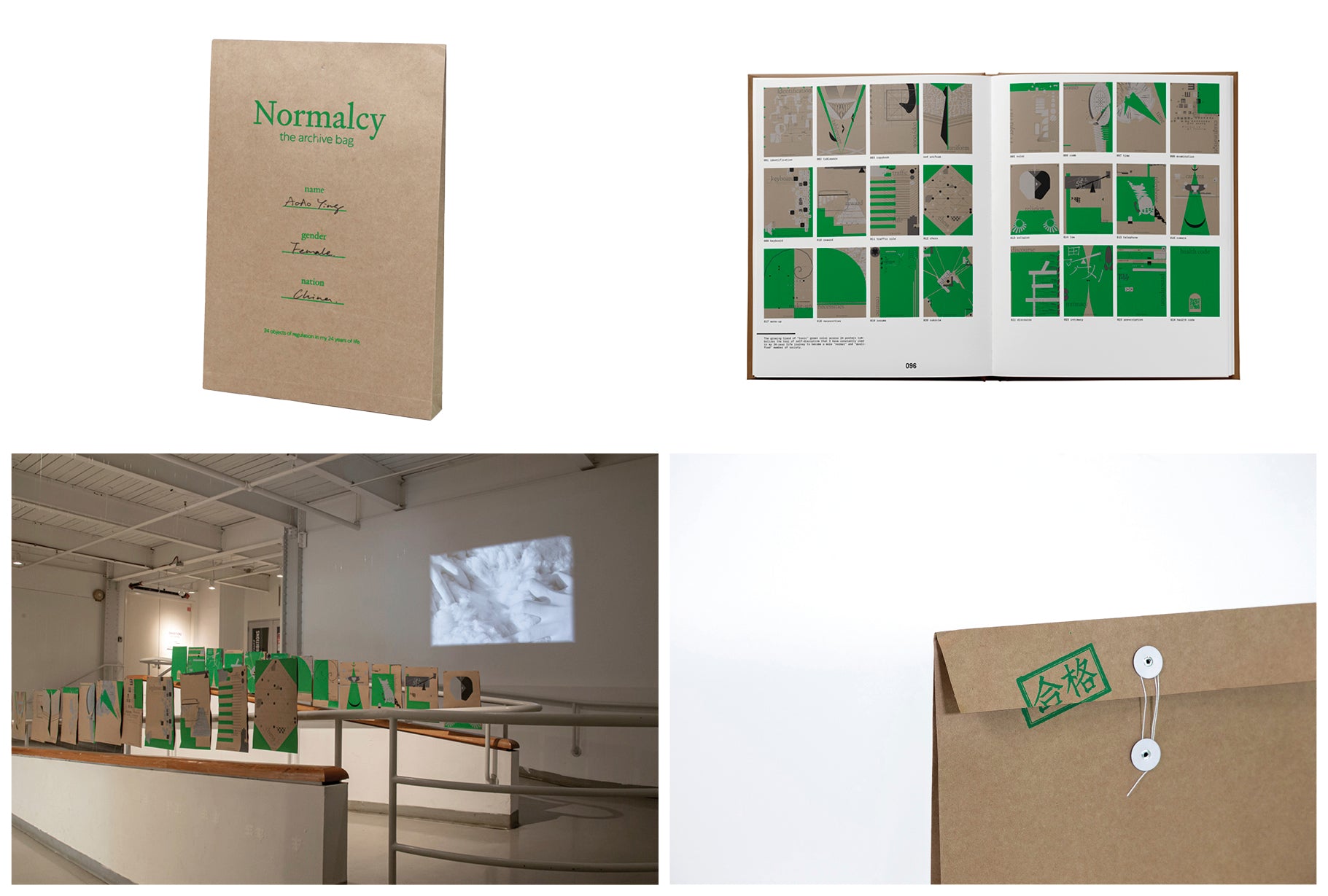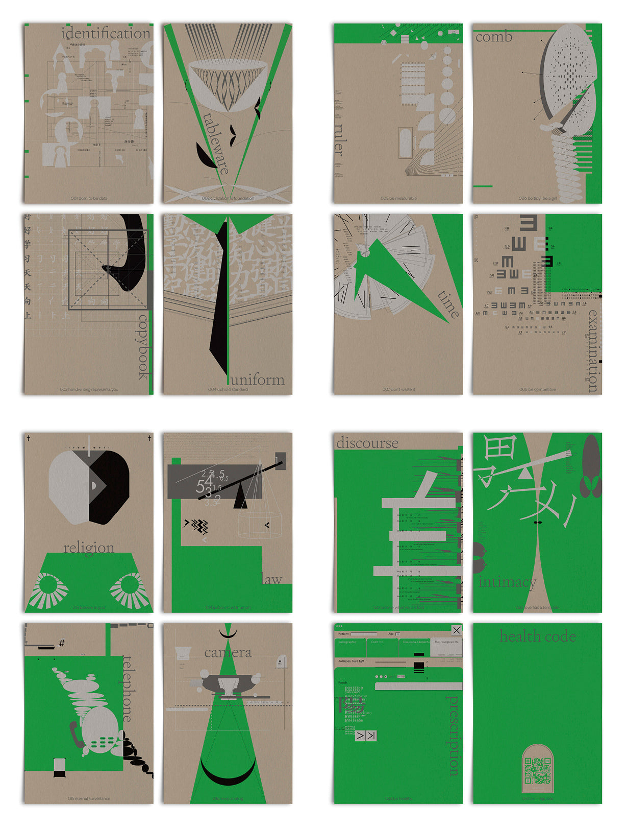 No one forces how you should behave, we learn it because it's normal. Normalcy is a series of 24 poster prints housed in an archival bag, with each one representing an item of self-discipline from the designer Aoao's life over the past 24 years. They range from identification, tableware, copybook, uniform, ruler, comb, time, examination, keyboard, reward, traffic rule, chess, religion, law, telephone, camera, make-up, necessities, resume, cubicle, discourse, intimacy, prescription, to health code. The green color represents concepts as "correct," "pass," and "qualified," and the increase of this green reflected in the posters signifies my gradual conformity to social norms. Normalcy is screen-printed on kraft paper, preserving the tactile quality of archival materials, while also emphasizing a vibrant and saturated green color. Through the visual “toxic” green hue, it prompts reflections on the concept of “normalcy.”