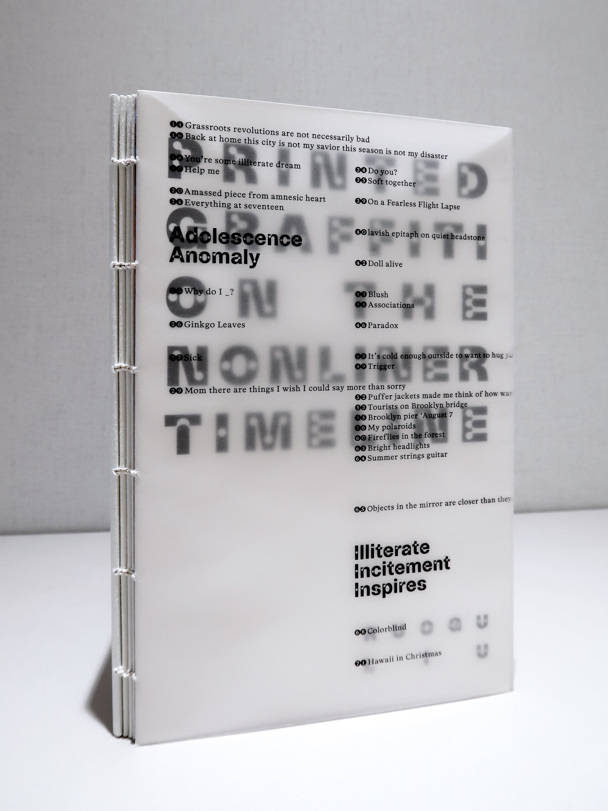 Printed Graffiti on the Nonlinear Timeline is a collection of impressions--of places, emotions, relationships--filtered through Ruogu Liu's fine-tuned ear for language, often incorporating wordplay, assonance, and neo-surrealist word associations that seek to connect the sound language to its meaning (and often lack thereof). In the process, she breaks open a rich interior space, postmarked by places and dates, where most of these poems are set. This collection is a journey toward hope and healing from a promising young poet whose work I can't wait to see more of in the world. ------ David Brunson, Poet, Translator